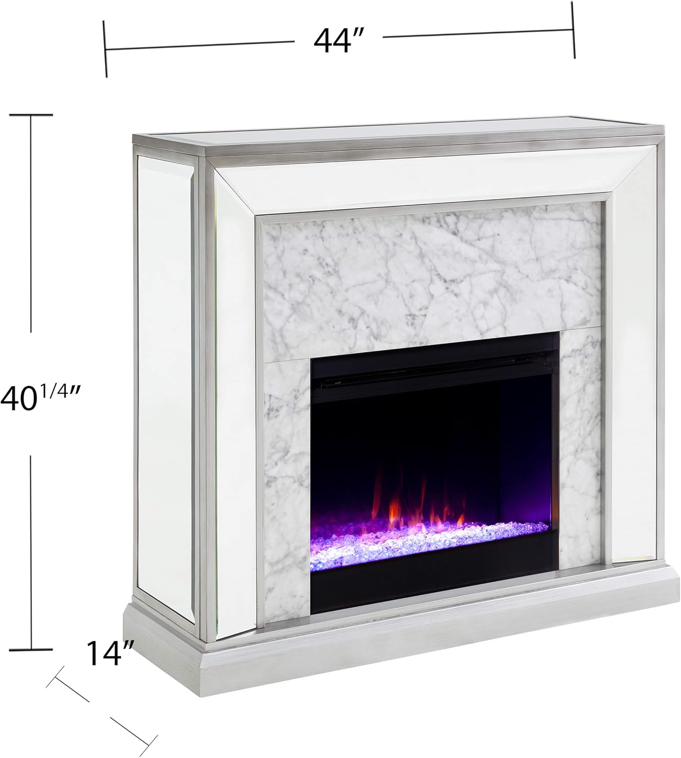 Glow up with this mirrored fireplace mantel. Reflective mirrored panels box in a faux marble surround, adding dimension to small spaces. Shimmering faux crystal adds ambiance with flickering LED flames, alternating colors, and lifelike embers, all controlled from the convenience of your sofa. Sophisticated style leaves its mark when you upgrade your living space with this mirrored faux marble electric fireplace.